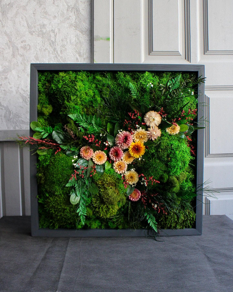 Lebendige Ästhetik: Das Kaleidoskop der Farben aus Moos und getrockneten Blumen ergibt ein auffälliges Kunstwerk, das gleichermaßen lebendig und beruhigend wirkt.