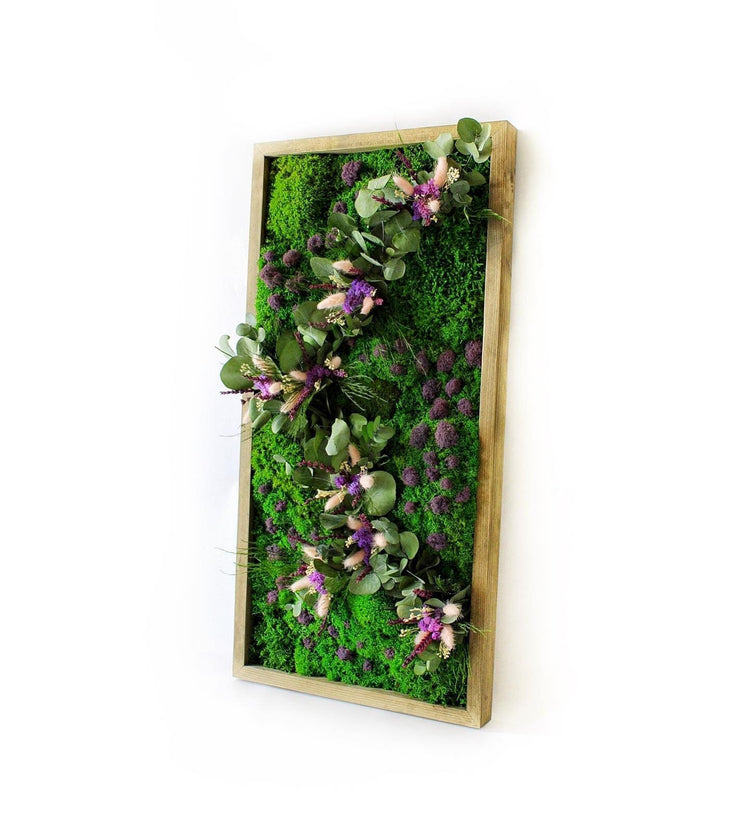Indulge in the tranquility of nature with our exquisite handcrafted framed moss and eucalyptus wall art, featuring a delightful purple lichen splash and Lagurus accent.