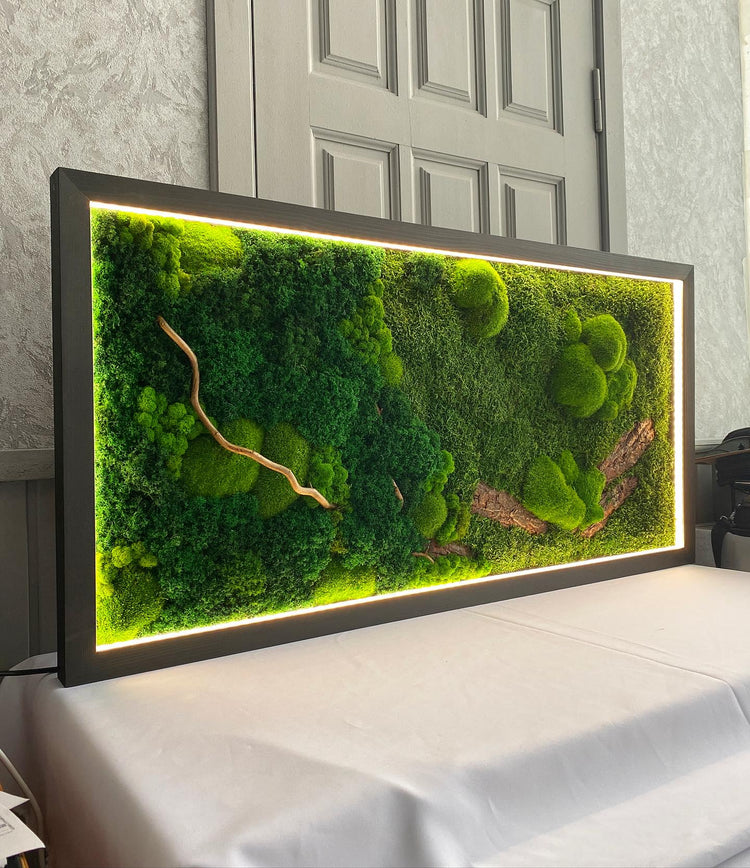 Illuminated Preserved Moss Wall Art with LED Lighting, Eco-Friendly Nature-Inspired Decor, Custom Wood & Moss Art, Unique Botanical Gift